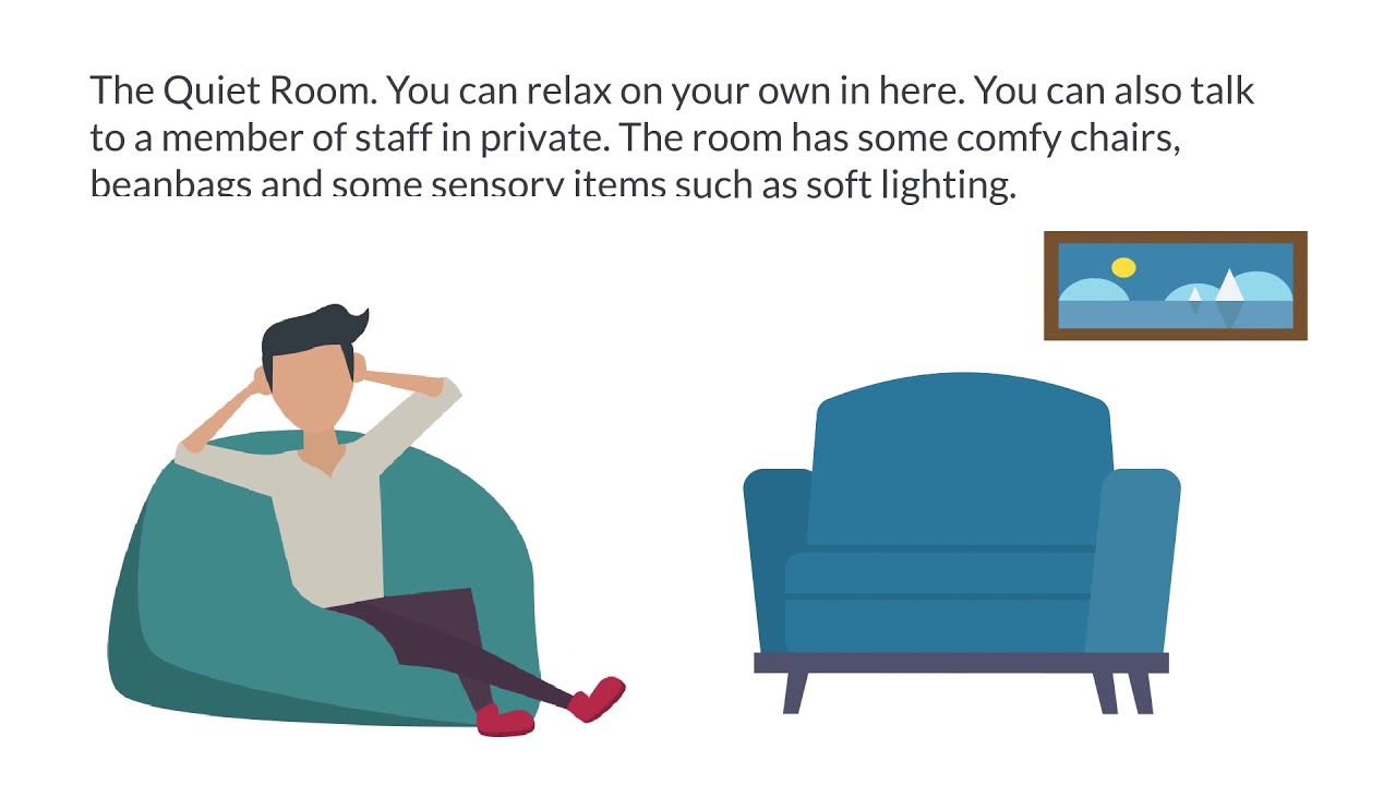 The Quiet Room You can relax on your own in here. You can also talk to a member of staff in private. The room has some comfy chairs, beanbags and some sensory items such as soft lighting.